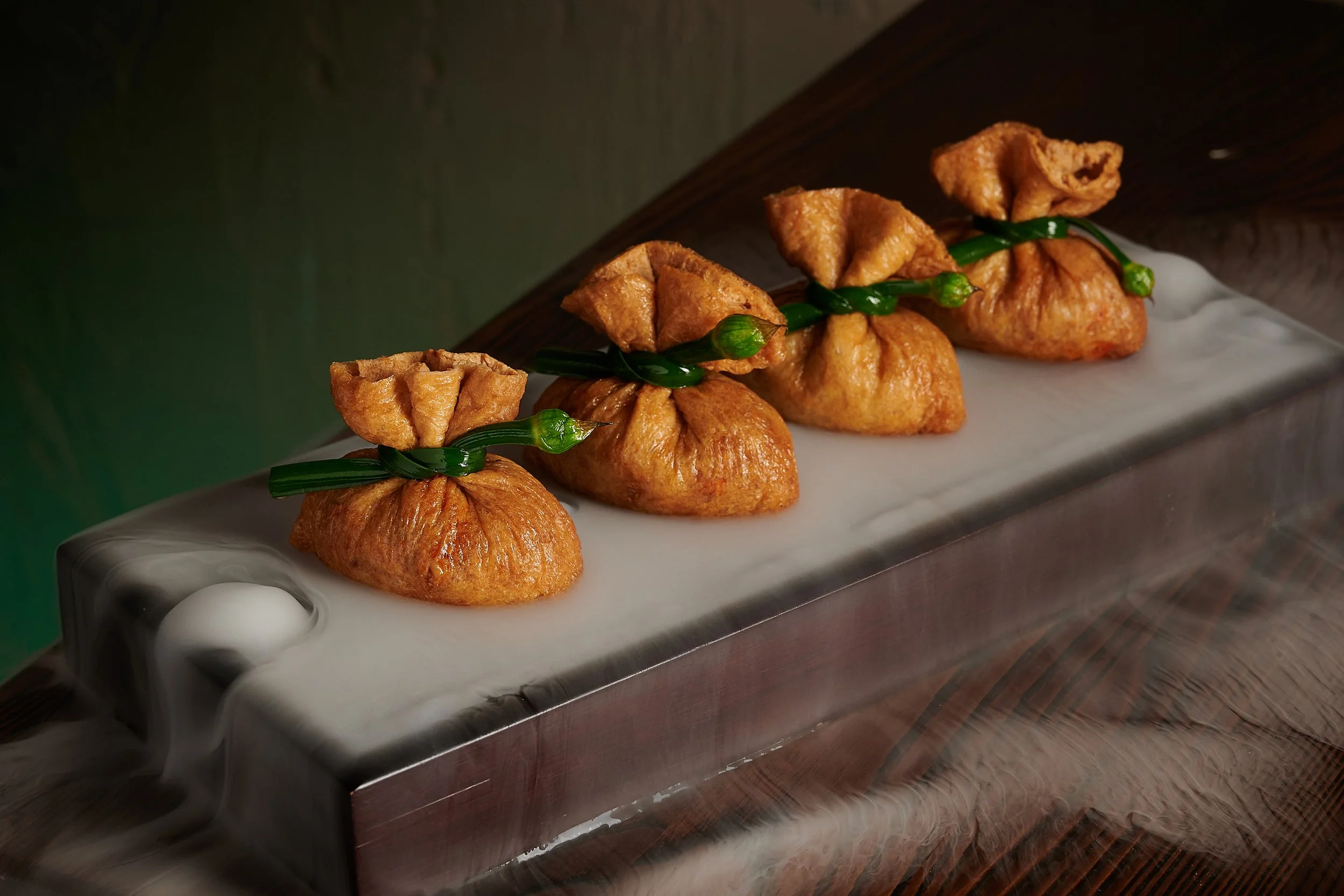 Stir fried mix vegetable & shrimp &tofu fill in soy tofu pouch